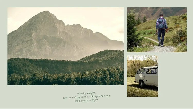 Wähle Farben, Schriftarten und Layouts, die deine Gefühle während der Reise am besten widerspiegeln. Verwende warme und lebendige Farbtöne für Momente der Begeisterung und kühle, ruhige Farben für nachdenkliche oder introspektive Erlebnisse.