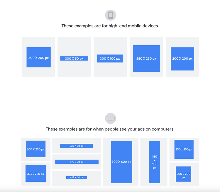 Wie die obigen Beispiele mit der freundlichen Genehmigung von Google Ads zeigen, gibt es verschiedene Standardbannergrößen für Webbanner, abhängig davon, wo auf einer Webseite du dein Banner positionieren möchtest.