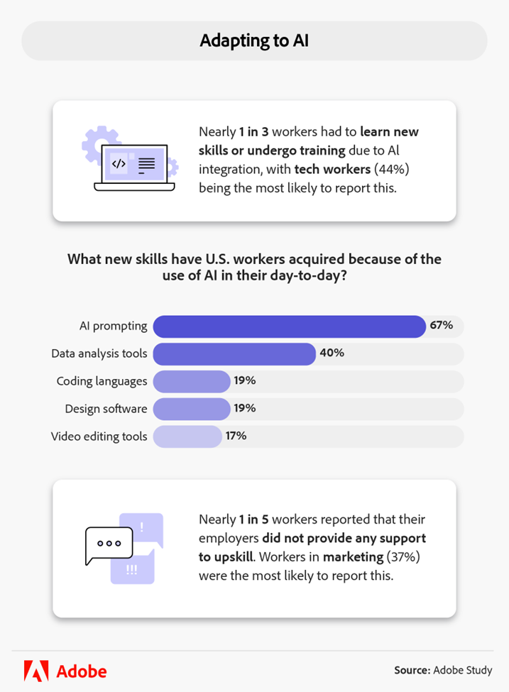 Allerdings weisen nicht alle dieses Selbstvertrauen auf. Ein Zehntel der Befragten gab an, dass sie sich hinsichtlich der Veränderungen durch KI am Arbeitsplatz unsicher fühlen. Obwohl KI in der Lage ist, die Erstellung von Marketinginhalten auf viele Arten zu beschleunigen (einschließlich der sekundenschnellen Generierung von Bildern), waren es gerade Marketingprofis, die bezüglich ihrer Fähigkeit, sich anzupassen, am häufigsten Bedenken äußerten (14 %).