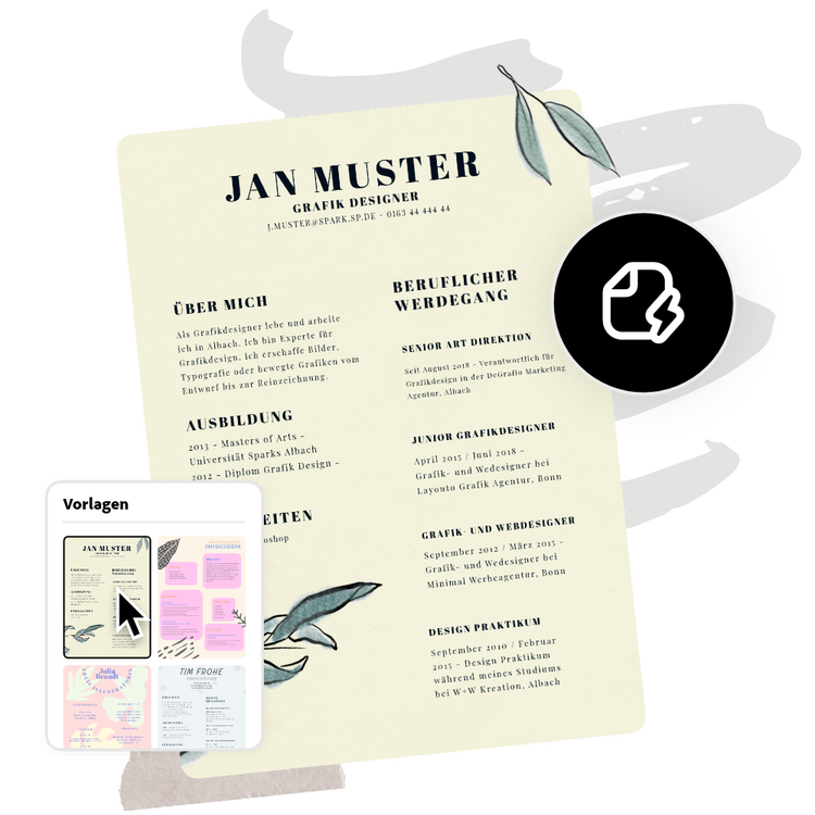 Präsentiere dich, deine Leistungen und deine Design-Expertise mit einem hochwertigen Lebenslauf, erstellt mit Adobe Express. Vorkenntnisse sind nicht erforderlich.