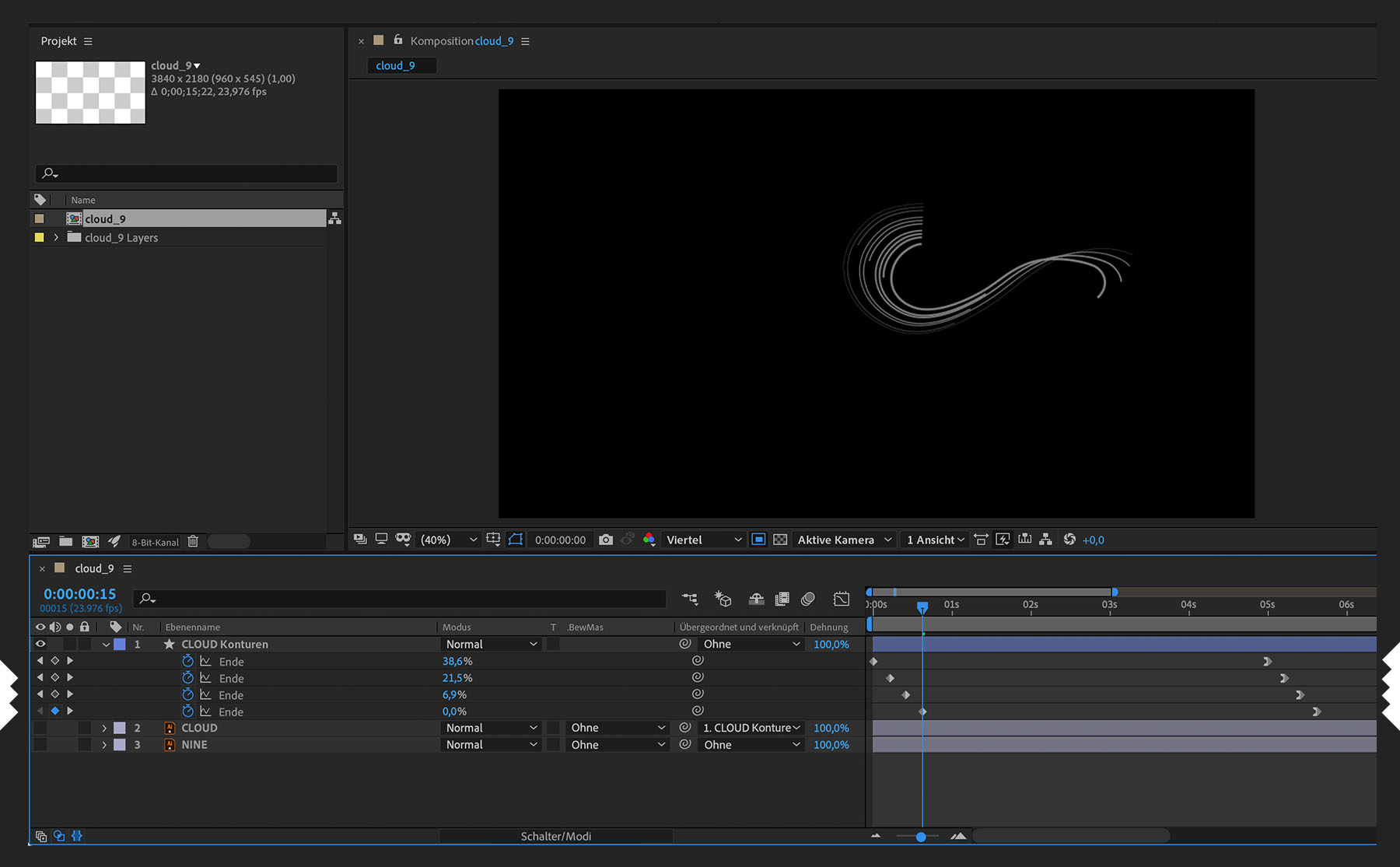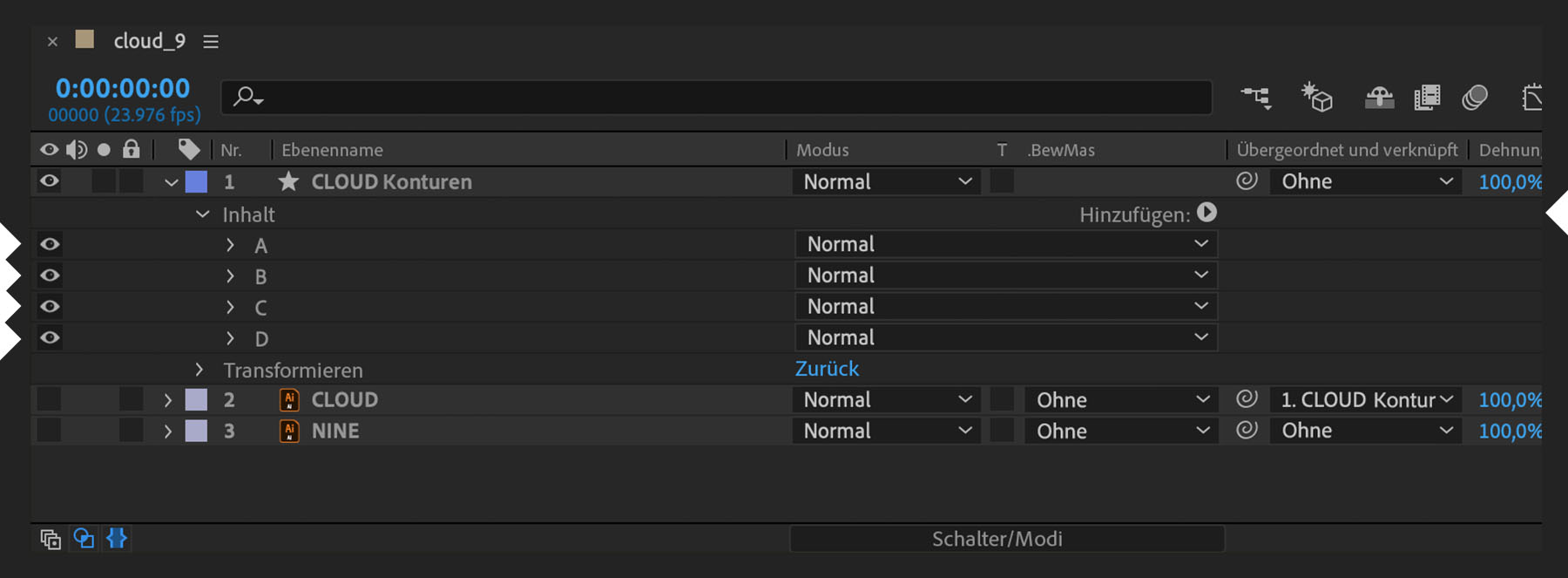 Öffne in After Effects den Arbeitsbereich „Standard“. Wähle „Datei > Importieren > Datei“. Navigiere zu deiner Illustrator-Datei mit dem Linienmuster. Wähle „Importieren als > Komposition – Ebenengrößen beibehalten“. Wenn deine Illustrator-Datei mehrere Ebenen enthält, wähle eine Ebene aus (in unserem Beispiel „Cloud“), und deaktiviere die Sichtbarkeit der anderen Ebenen. Mache einen Rechtsklick bzw. Ctrl-Klick auf die Ebene. Wähle „Erstellen > Formen aus Vektorebene erstellen“. Dadurch wird direkt über der Ebene eine neue Ebene mit Konturen erstellt, die als Maske fungiert. Richte sie als übergeordnete Ebene zur neuen Formebene ein, indem du auf der Zeitleiste in der Spalte „Übergeordnet und verknüpft“ statt der Einstellung „Ohne“ die Ebene mit den Konturen wählst. (Wenn diese Spalte nicht sichtbar ist, klicke mit der rechten Maustaste bzw. bei gedrückter Ctrl-Taste auf eine beliebige Spalte, und wähle „Spalten > Übergeordnet und verknüpft“.)