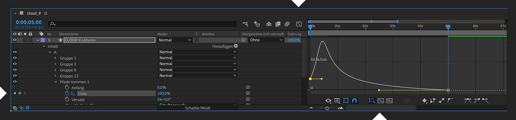 Jetzt kannst du jede Gruppe einzeln animieren. Öffne die Optionen für eine Gruppe. Klicke auf „Hinzufügen“. Wähle „Pfade trimmen“. Positioniere den Abspielkopf an den Anfang der Komposition – sofern die Animation hier starten soll –, und blende die Optionen für „Pfade trimmen 1“ ein. Setze für „Ende“ einen Keyframe mit dem Wert „0 %“. Verschiebe den Abspielkopf an die Stelle, an der die Animation enden soll (z. B. bei 5:00). Setze einen weiteren Keyframe für „Ende“ mit dem Wert „100 %“. Klicke mit der rechten Maustaste bzw. bei gedrückter Ctrl-Taste auf den zweiten Keyframe für „Ende“. Wähle „Keyframe-Assistenten > Easy Ease In“. Öffne den Diagramm-Editor. Ziehe den Griff auf der Geschwindigkeitskurve, um die Animation langsam enden zu lassen.