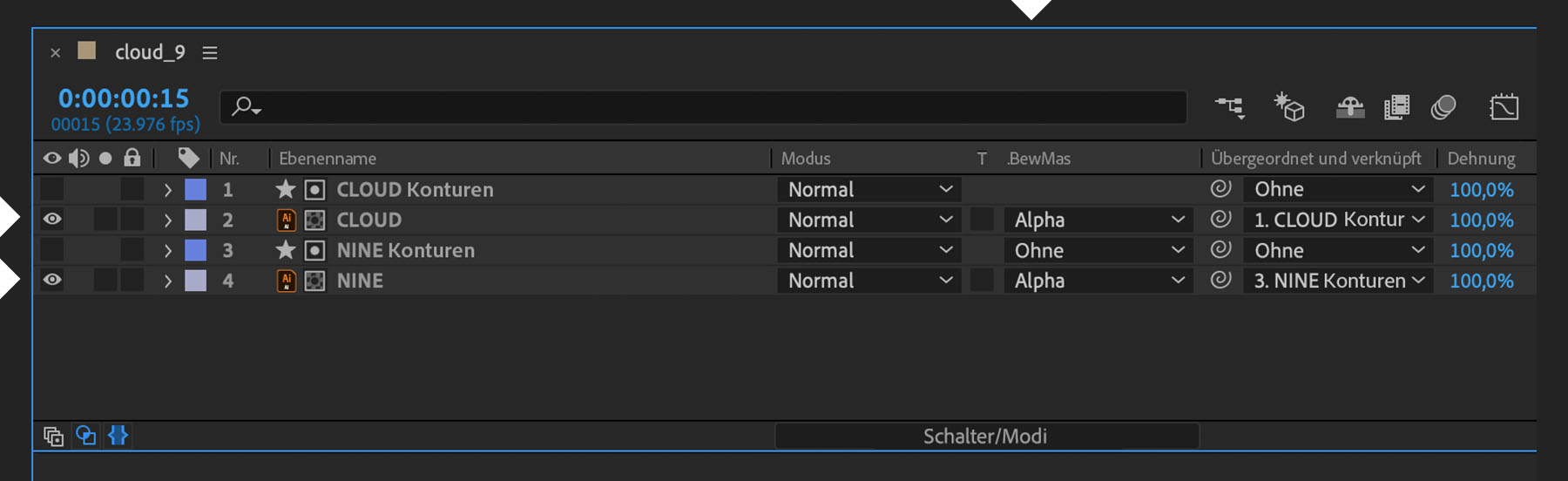 Aktiviere jetzt die Sichtbarkeit aller Illustrator-Ebenen. Wähle für jede Ebene im Dropdown-Menü für die bewegte Maske „Alpha-Maske ‚[Ebene mit Konturen]‘“. Dadurch wird die Sichtbarkeit der Ebene mit den Konturen automatisch deaktiviert, sodass die Verlaufsebene zu sehen ist.