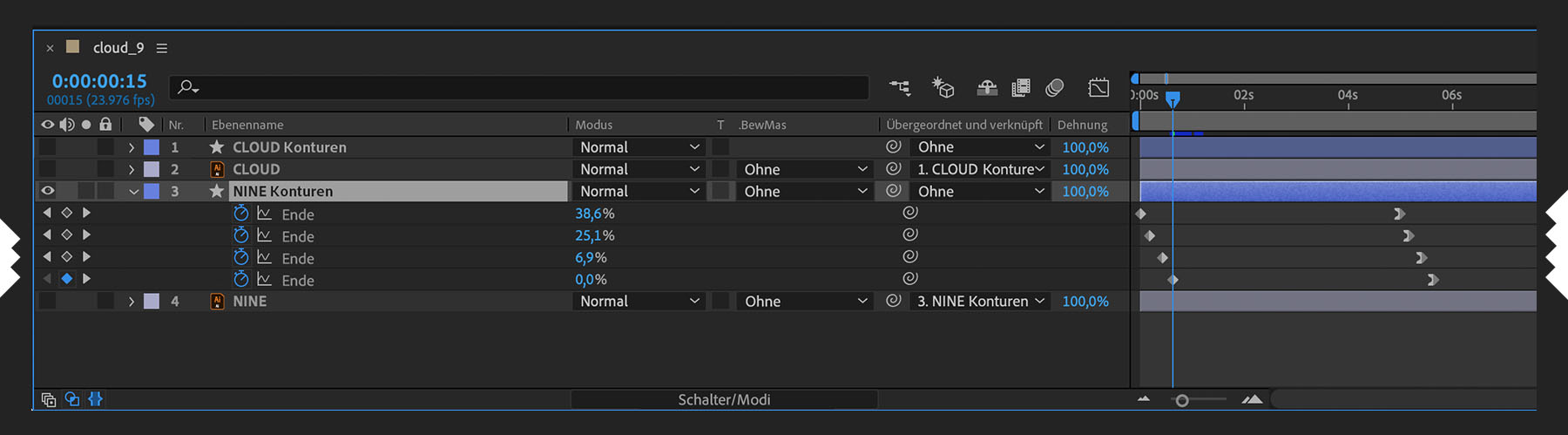 Wenn du mit der Animation der Konturen des Linienmusters zufrieden bist, deaktiviere die Sichtbarkeit der Ebene. Aktiviere die Sichtbarkeit einer anderen Vektorebene (in unserem Beispiel ist es Ebene „NINE“). Wiederhole die oben genannten Schritte für diese Ebene: Wandle sie in eine Formebene um. Lege sie als übergeordnete Ebene zur neuen Ebene mit den Konturen fest. Erstelle Gruppen. Wende die Option „Pfade trimmen“ für jede Gruppe an. Animiere jede Gruppe einzeln. Führe die Schritte für alle übrigen Vektorebenen durch, die du aus Illustrator importiert hast.