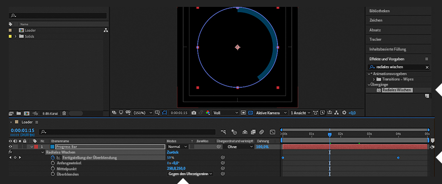 Wende den Effekt „Radiales Wischen“ auf die Ebene an. Wähle für „Überblenden“ die Option „Gegen den Uhrzeigersinn“. Setze für „Fertigstellung der Überblendung“ Keyframes von 100 % bis null über die Länge der Komposition hinweg – bzw. etwas kürzer, sodass am Ende noch Zeit ist, um zu erkennen, dass der Prozess zu 100 Prozent abgeschlossen wurde. Spiele die Komposition ab, und überprüfe, wie die Fortschrittsanzeige in einem Kreis verläuft.