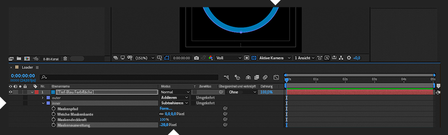 Dupliziere die Maske. Diese Maske markiert den inneren Rand der Fortschrittsanzeige. Drücke MM, um die Eigenschaften für beide Masken zu öffnen. Setze die Füllmethode für die untere, innere Maske auf „Subtrahieren“. Gib einen negativen Wert für „Maskenausweitung“ ein, bis ein deutlich sichtbarer Rand in der Fortschrittsanzeige entstanden ist.