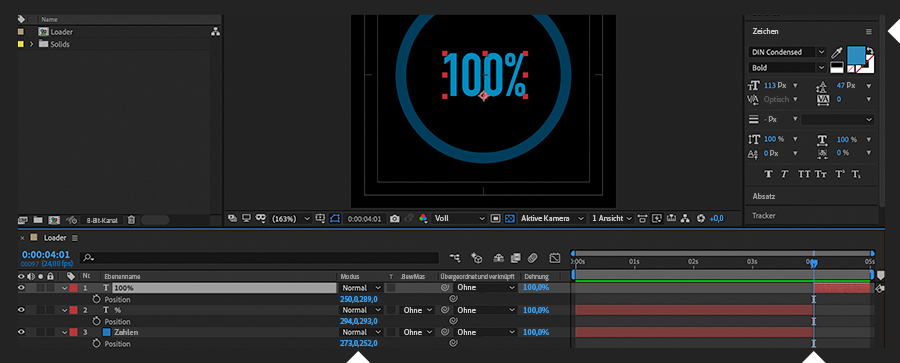 Um die Zahlenanzeige zu vervollständigen, füge eine neue Textebene zur Komposition hinzu. Gib ein Prozentsymbol mit derselben Schriftart, Farbe, Größe und Laufweite wie für die Zahl ein. Positioniere die Prozent- und Zahlenebenen so, dass sie als Gruppe zentriert in der Komposition erscheinen. Dupliziere die Prozentebene. Ändere ihren Namen in „100 %“. Trimme diese Ebene, sodass sie erst aufgerufen wird, wenn der Ladeprozess „99 %“ erreicht hat. Spiele die Komposition ab, und überprüfe, wie der Prozentwert bis 100 % kontinuierlich steigt.