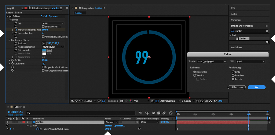 Füge eine neue Farbfläche (beliebige Farbe) oberhalb von der Komposition ein. Wende den Effekt „Zahlen“ auf diese Ebene an. Wähle im Dialogfeld „Zahlen“ eine schlanke Schrift aus (in diesem Beispiel haben wirDIN Condensed aus Adobe Fonts verwendet). Achte darauf, dass die Ausrichtung „Rechts“ ist. Gib im Bedienfeld „Effekteinstellungen“ für „Dezimalstellen“ den Wert „0“ ein, sodass nur ganze Zahlen angezeigt werden. Wähle die passende Flächenfarbe, Größe und Laufweite für das Design. Deaktiviere „Proportionale Abstände“. Um den Prozentwert nach und nach zu erhöhen, setze Keyframes für „Wert/Versatz/Zufall“ von 0 bis 99 über die Dauer des Ladeprozesses hinweg – minus einem Frame.