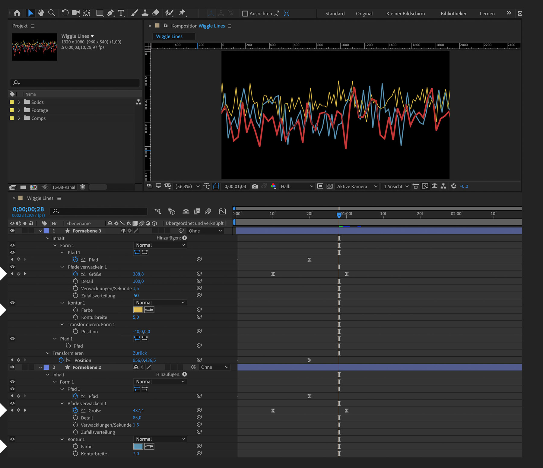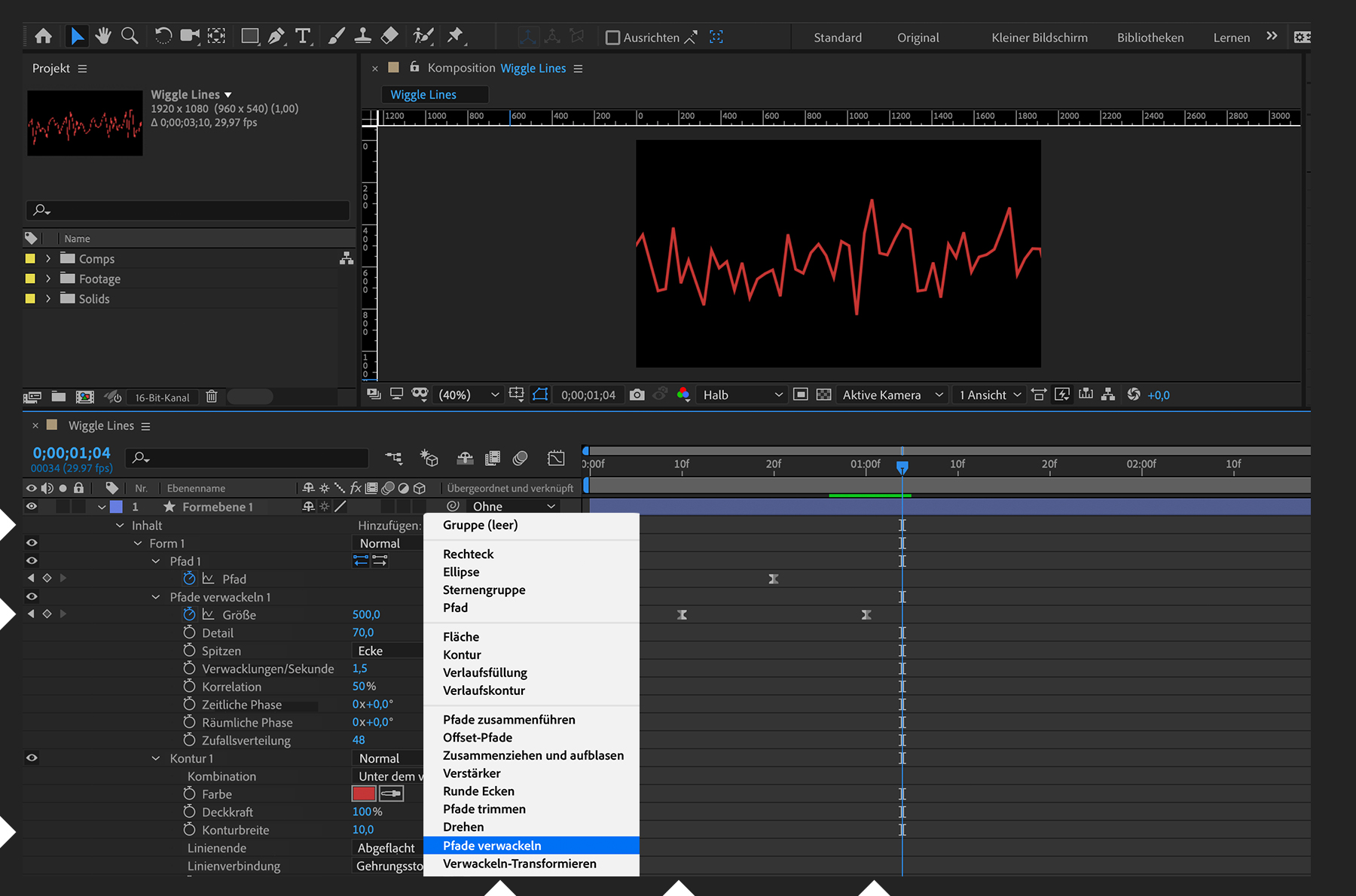Erzeuge in Adobe After Effects pulsierende Linien, indem du den Animationseffekt „Pfade verwackeln“ auf Formebenen anwendest.