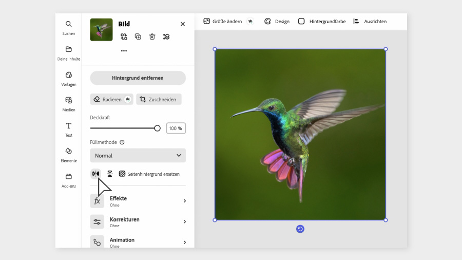 Änderungen wie Spiegeln und Drehen sind schnell erledigt, z. B. wenn ein Foto im falschen Winkel steht, du Platz für Text oder Formen benötigst oder einfach nur der Gesamteindruck eines Bilds optimiert werden soll. Dabei kannst du mit unterschiedlichen Winkeln experimentieren und Änderungen schnell rückgängig machen, wenn sie nicht funktionieren.