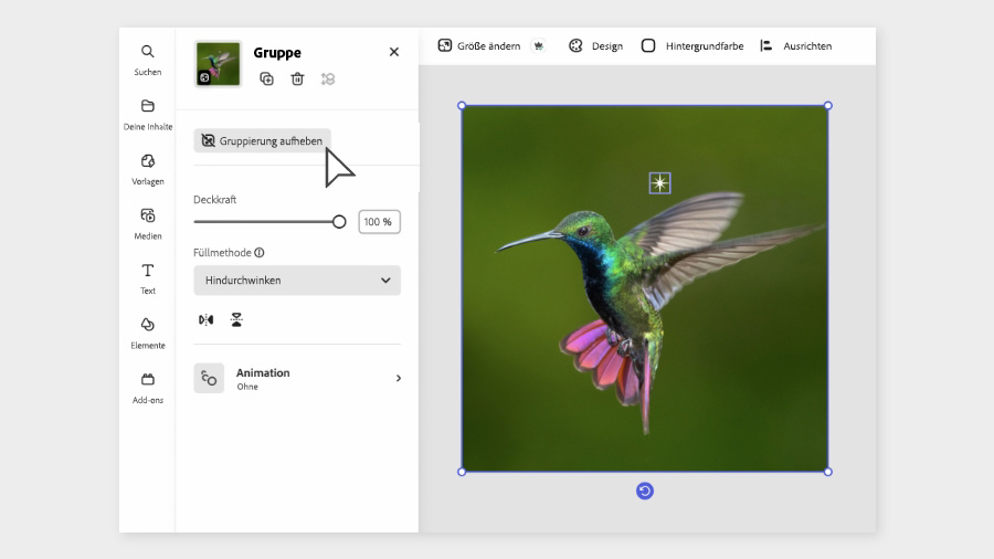 Wenn du Fotos versehentlich gruppiert hast oder doch nur ein einzelnes Foto bearbeiten möchtest, löse die Gruppierung einfach auf. Klicke auf den Button Gruppierung aufheben.