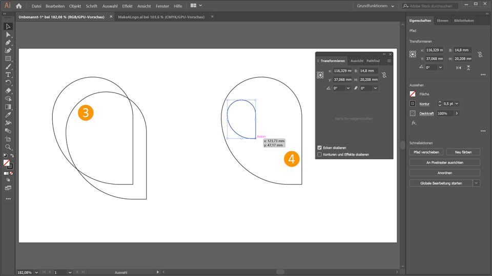 4. Kopie ausgewählt lassen und das Bedienfeld Transformieren öffnen (Fenster > Transformieren). Ecken skalieren aktivieren. Bei gedrückter Umschalttaste an einem Griffpunkt ziehen, um die Größe zu ändern. Dann Kopie an die gewünschte Position ziehen.