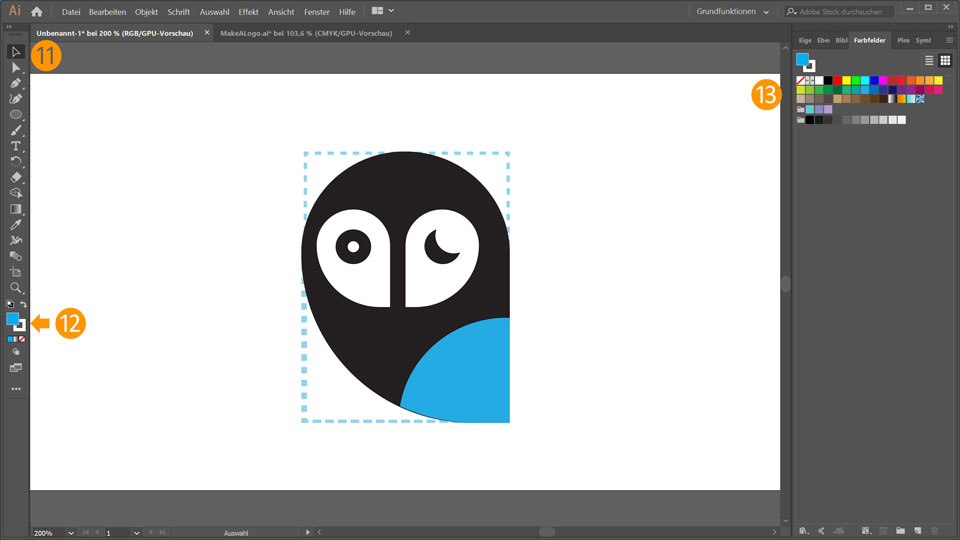 13. Flügel der Eule auswählen, Bedienfeld Farbfelder öffnen und auf den Flügel eine andere Flächenfarbe anwenden.