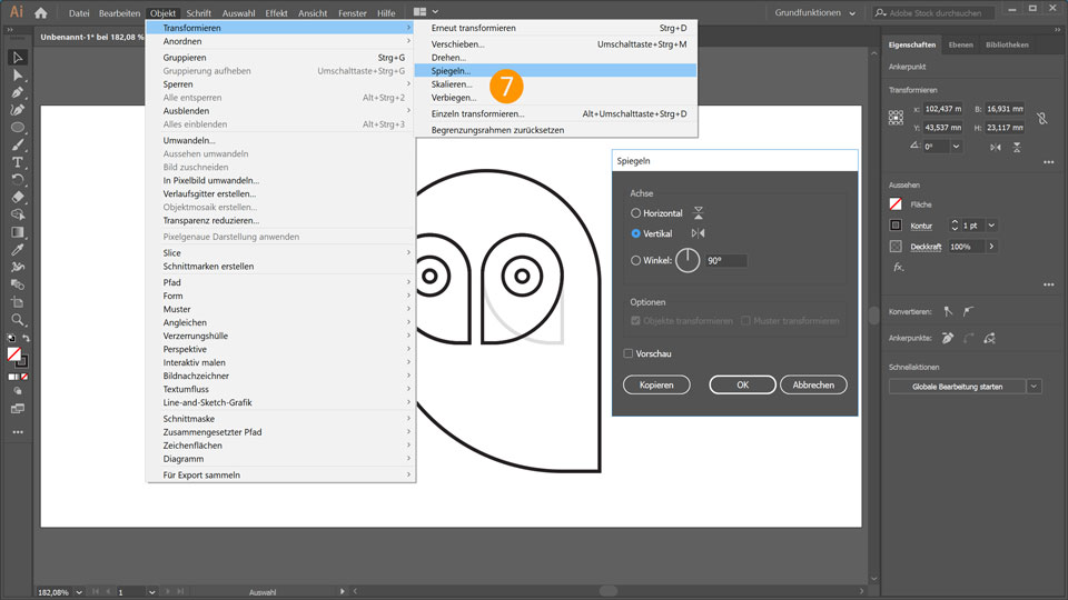 7. Bei ausgewählter Kopie Objekt > Transformieren > Spiegeln und Vertikal wählen, um das zweite Auge zu erstellen.
