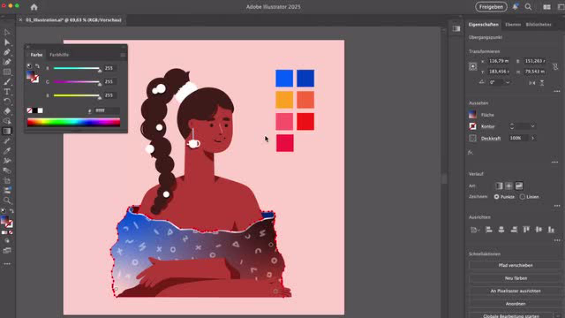 Mithilfe der Einstellungen des Freihandverlaufs färben wir das Oberteil unserer Illustration ein. Die automatisch erzeugten Punkte lassen sich bearbeiten, ändern, in ihrer Position und Reihenfolge verschieben, bis die Farben so verlaufen, wie du es dir wünschst.