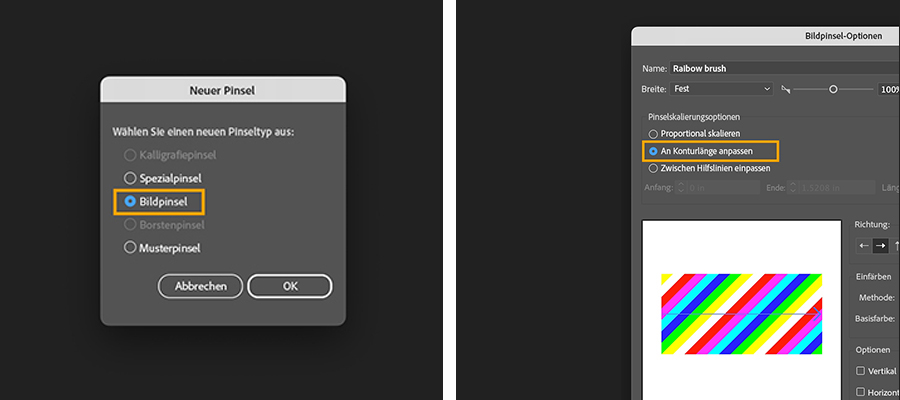 Wähle im Fenster „Neuer Pinsel“ die Option „Bildpinsel“ und klicke auf „OK“. Benenne den Pinsel, wähle „An Konturlänge anpassen“ und klicke auf „OK“.