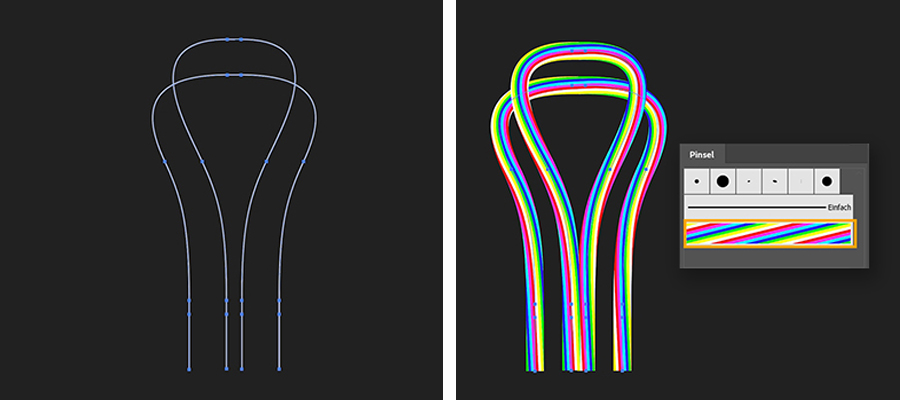 Wähle das Auswahl-Werkzeug und klicke mit gedrückter Umschalttaste auf beide Pfade, um sie auszuwählen. Klicke dann im Bedienfeld „Pinsel“ auf den neuen Regenbogenpinsel, um die Grafik zu übernehmen.