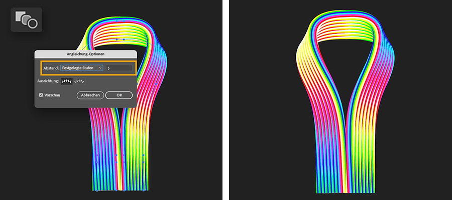 Wenn beide Pfade ausgewählt sind, wähle „Objekt“ > „Angleichen“ > „Erstellen“. Erstelle dann ein schleifenähnliches Design. Doppelklicke dazu auf das Angleichen-Werkzeug, um die Angleichung-Optionen so einzustellen, dass sie den in der Abbildung dargestellten Merkmalen entsprechen.