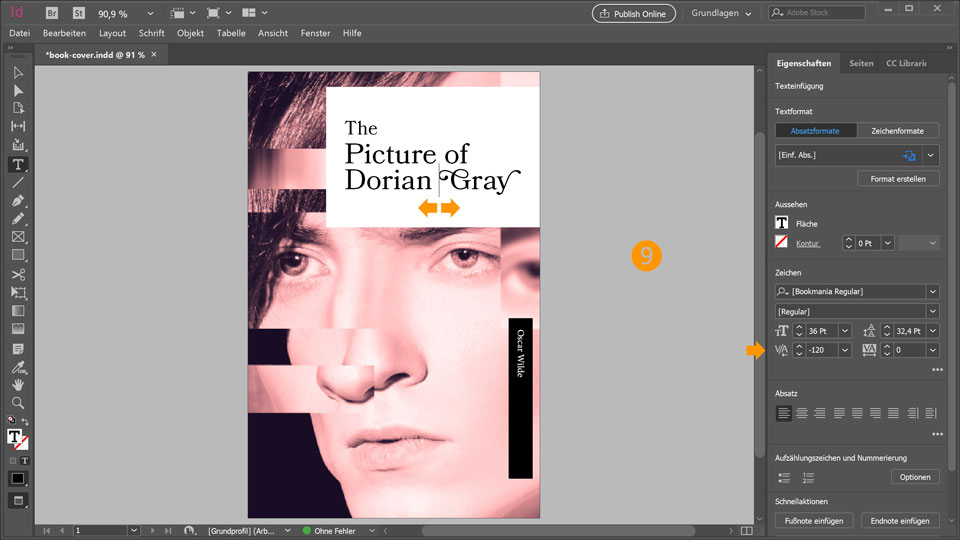 9. Text-Werkzeug aufrufen, Cursor zwischen zwei Buchstaben positionieren, Wahl- (macOS) bzw. Alt-Taste (Windows) gedrückt halten und die Nach-links- bzw. die Nach-rechts-Taste drücken, um den Abstand zu verkleinern bzw. zu vergrößern. Oder im Bedienfeld Eigenschaften im Abschnitt Zeichen im Feld Kerning einen numerischen Wert eingeben. Der Wert lässt sich auch mit der Nach-oben- bzw. der Nach-unten-Taste erhöhen bzw. verringern.