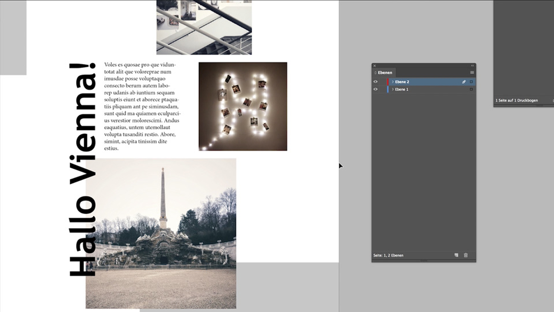 Ebenen kennen Sie vielleicht schon aus Photoshop. In InDesign gibt es auch Ebenen, jedenfalls ähneln Sie eher den Ordnern, in denen Ebenen eingeordnet sind, um Orientierung zu geben. Sie trennen und ordnen zum Beispiel Texte, Bilder und Elemente voneinander, geben Ordnung und Hierarchie. So kann zum Beispiel Text immer über Bilder laufen, wenn Sie einfach die Bildebene nach unten setzen. Je komplexer Ihr Dokument, desto weniger können Sie auf Ebenen verzichten. Unter „Fenster > Ebenen“ finden Sie das gleichnamige Fenster. Alle Inhalten finden Sie darin unter „Ebene 1“. Mit dem Augensymbol können Sie die Sichtbarkeit jeder Ebene ein- und ausschalten. Mit dem Dokumenten-Symbol unten können Sie eine neue Ebene erstellen.