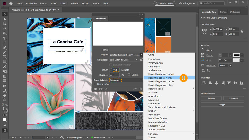 8. Klicke mit dem Auswahl-Werkzeug bei gedrückter Umschalttaste auf das weiße Rechteck und das Logo „La Concha Café“. Wähle im Dropdown-Menü Vorgabe die Option Hereinfliegen von links.
