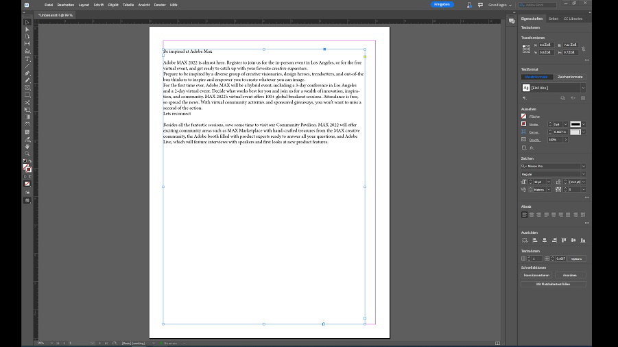 Erstelle ein neues InDesign-Dokument mit mindestens 1.000 Zeichen, damit die KI-Engine den Text analysieren kann.