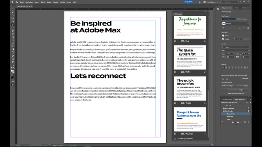 InDesign enthält eine erste Version der neuen Funktion „Automatisch formatieren“, die auf unserer KI-Technologie Adobe Sensei basiert. Damit kannst du mehrere unformatierte Textabschnitte gleichzeitig umgestalten – mit nur einem Klick. Die Funktion analysiert den Text und formatiert ihn automatisch, ob Überschrift, Fließtext oder Listen.