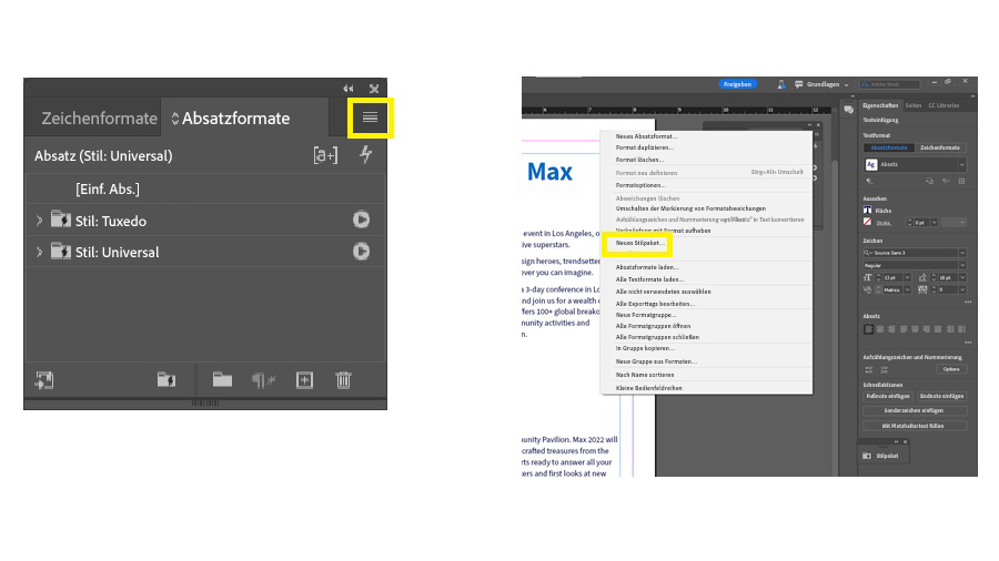 Öffne das Menü neben „Absatzformate“, und wähle „Neues Stilpaket“.