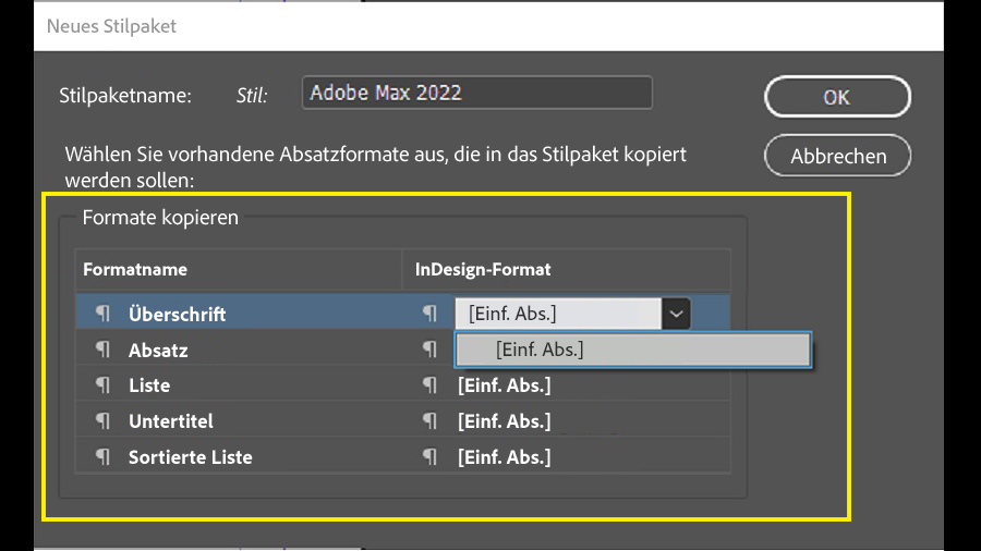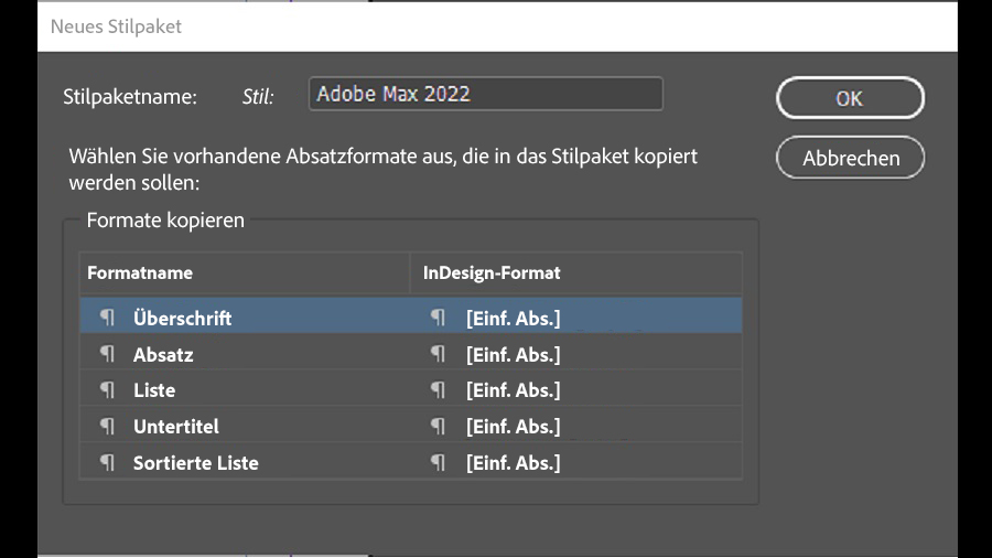 Das Dialogfeld „Neues Stilpaket“ wird angezeigt. Gib dem Stilpaket einen Namen, und wähle im Dropdown-Menü die Absatzformate aus, die du kopieren willst. InDesign dupliziert diese Formate und fügt sie in den Ordner mit dem neuen Stilpaket ein. Wenn du alle Formate zugeordnet hast, klicke auf „OK“.
