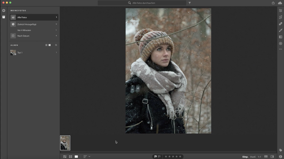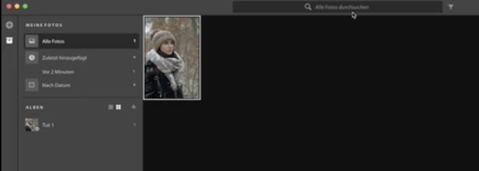 Wenn Sie auf das „+“-Symbol unter „Alben“ klicken, können Sie ein neues Album anlegen, hier im Beispiel mit dem Namen „Tut 1“. Sie können Bilder aus der Lightroom-Bibliothek auf den Ordner ziehen oder Bilder wie im ersten Schritt hinzufügen.