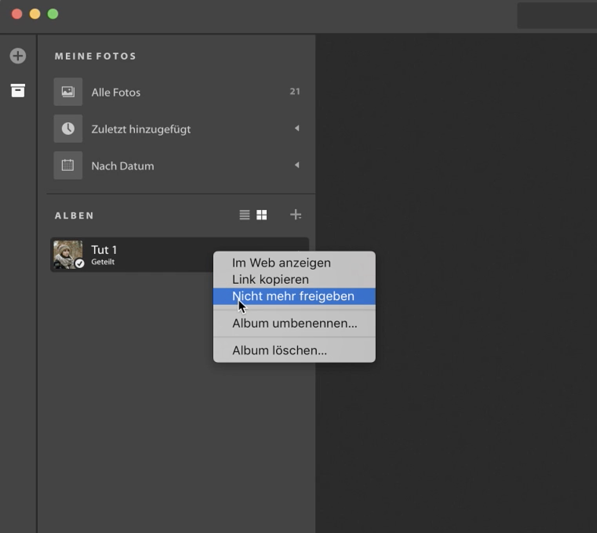 Übrigens können Sie den Link jederzeit wieder sperren, indem Sie mit der rechten Maustaste wieder auf das Album klicken, und diesmal „nicht mehr Freigeben“ wählen.