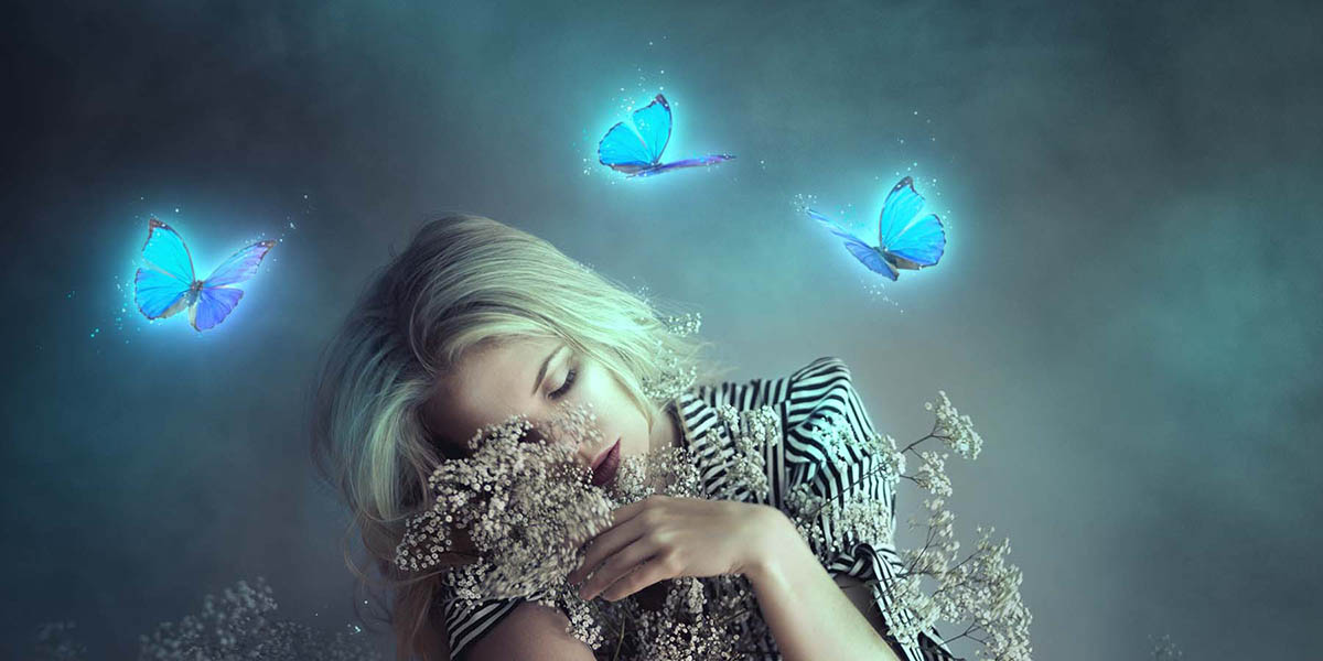 Lerne in diesem Tutorial, wie du die Schmetterlinge im Bild zum Leuchten bringst, blaues Licht malst und Glitzerstaub einfügst.