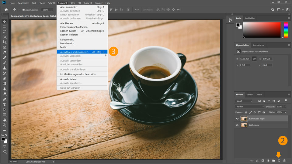 3. Starte den Modus Auswählen und maskieren. Dazu wählst du Auswahl > Auswählen und maskieren.