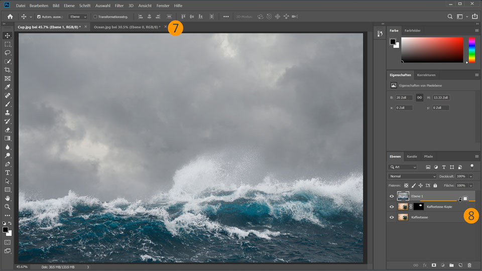 7. Öffne die Beispieldatei Ocean.jpg. Um sie zum Dokument mit der Kaffeetasse hinzuzufügen, wähle Auswahl > Alles auswählen. Kopiere die Auswahl, und füge sie in der Datei „Cup.jpg“ ein.