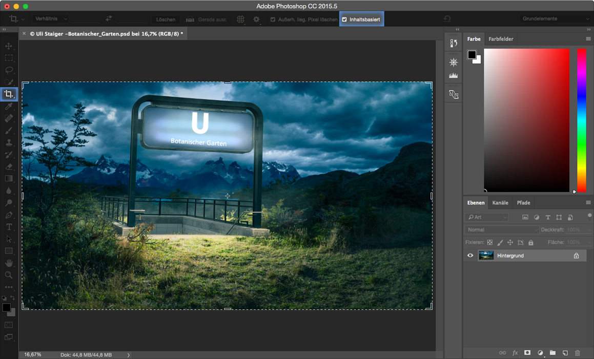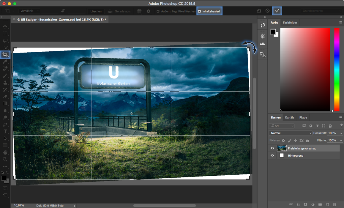 Mit dem Werkzeug für inhaltsbasiertes Freistellen in Photoshop CC werden leere Bereiche beim Freistellen eines Bildes automatisch mit passendem Inhalt gefüllt.