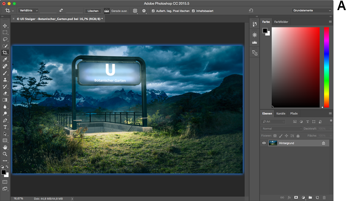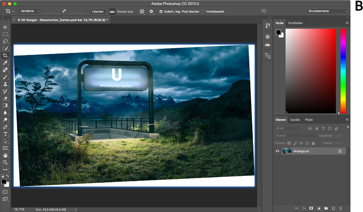Mit der Option „Inhaltsbasiert“ umgehen Sie dieses Problem (A). Der gedrehte Freistellungsrahmen wird erweitert, und leere Bereiche werden automatisch mit passendem Inhalt gefüllt.