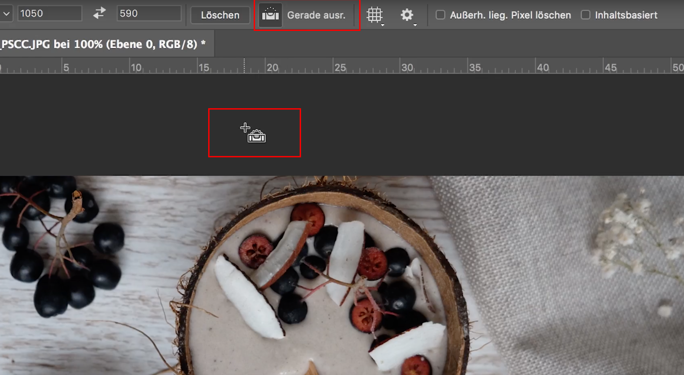 Bilder müssen oft begradigt werden. Klicken Sie auf das Begradigungswerkzeug (Wasserwaage) und ziehen Sie mit gedrückter Maustaste eine Referenzlinie entlang einer Stelle im Bild, die gerade sein soll. Sobald Sie die Maustaste loslassen, passt Photoshop das Bild automatisch an die Referenzlinie an. Das Foto wird begradigt.