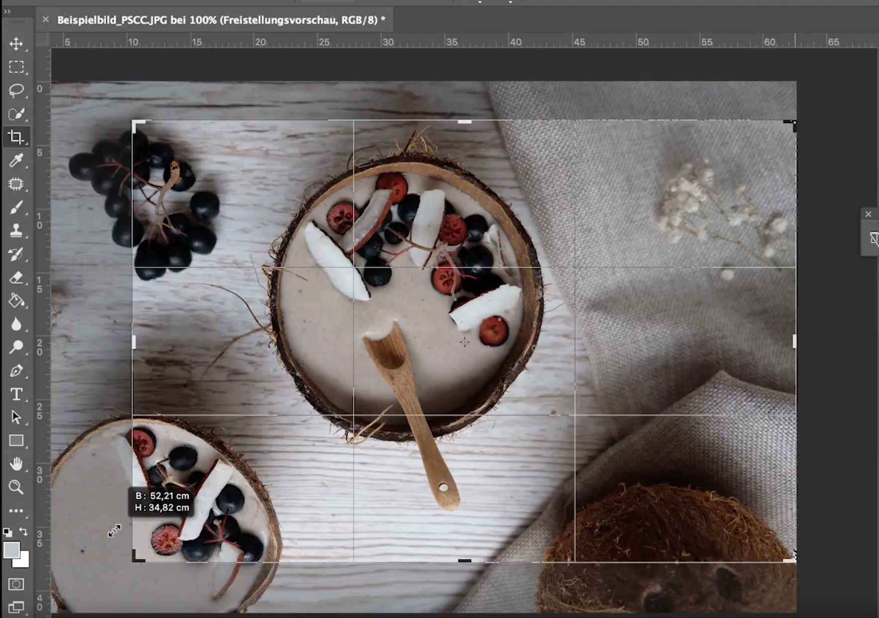 Oft muss es beim Fotografieren schnell gehen - etwa bei der Food-Fotografie. Daher stimmt oft der Bildausschnitt nicht optimal. Um die ungewünschten Bereiche des Fotos zu entfernen, benutzen Sie das Freistellungswerkzeug. Sobald Sie auf das Werkzeug klicken, öffnet sich ein Freistellungsrahmen. Sie können nun den Rahmen durch Ziehen an den Ecken beliebig anpassen. Mit der Return-Taste erstellt Photoshop einen neuen Bildausschnitt und entfernt den außerhalb liegenden Bereich.