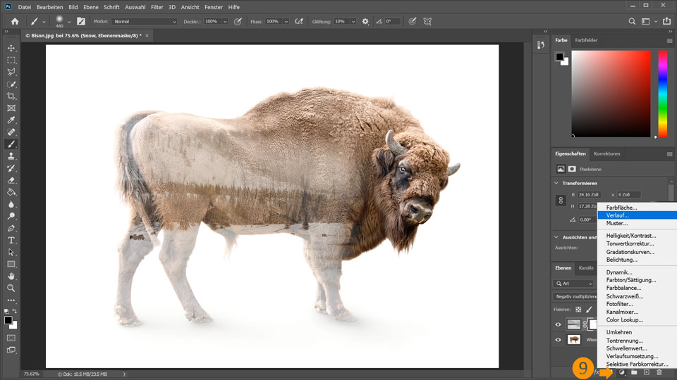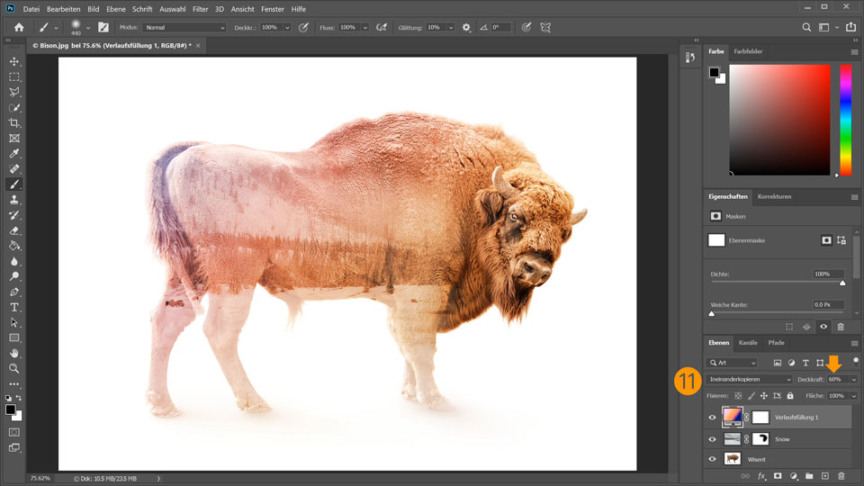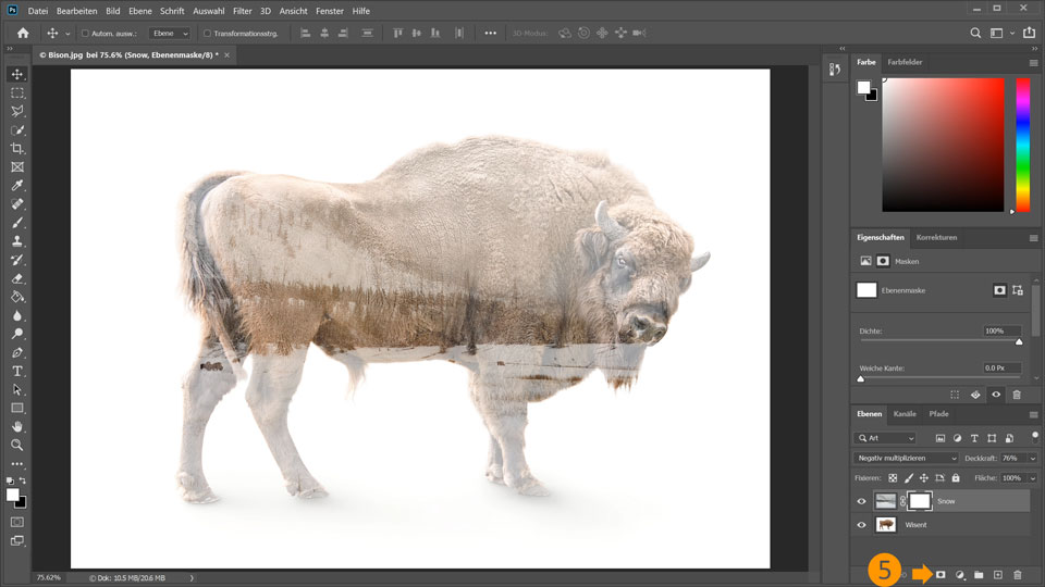 Tipp: Wenn du eine Ebenenmaske zur Bearbeitung auswählst, sind nur die Farben Schwarz und Weiß verfügbar. Male mit Schwarz auf der Ebenenmaske, um Details der darunterliegenden Ebene „Wisent“ sichtbar zu machen, oder mit Weiß, um Details zu verbergen.