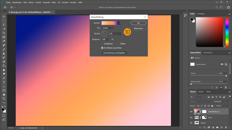 10. Ändere im Dialogfeld Verlaufsfüllung den Winkel in 130°. Wähle im Dropdown-Menü „Verlauf“ eine Farbkombination aus.