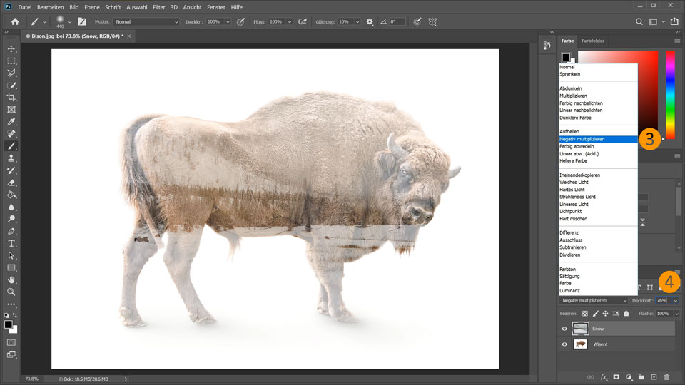 3. Wähle für die ausgewählte Ebene „Schnee“ im Bedienfeld Ebenen im Dropdown-Menü Mischmodi die Option Negativ multiplizieren aus.