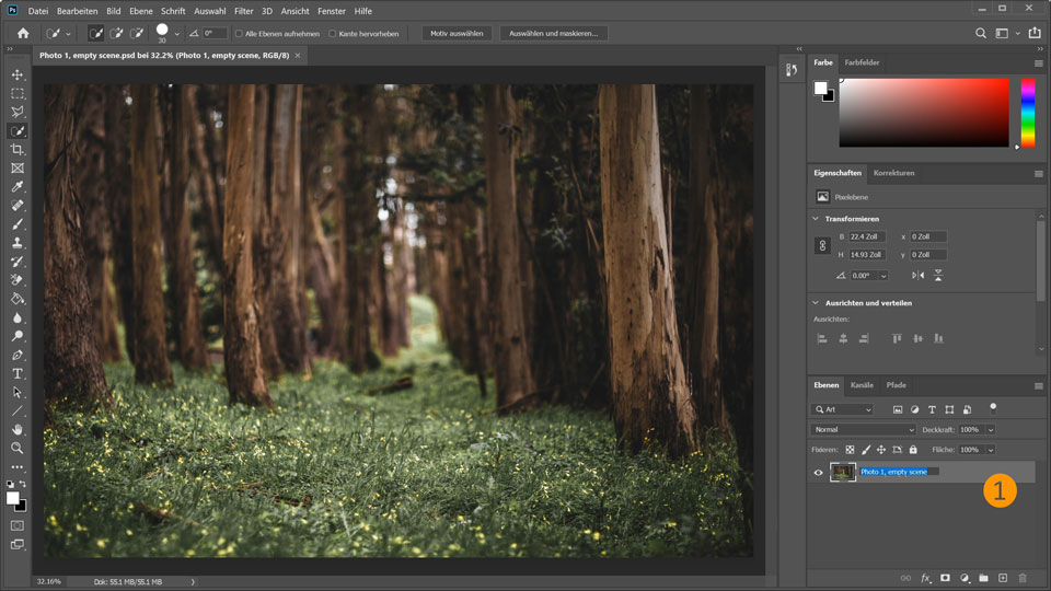 1. Lade dieBeispieldateien herunter. Öffne in Photoshop die Datei „Photo 1, empty scene.jpg“. Ändere den Standardnamen der Ebene „Hintergrund“ in „Foto 1, leere szene“.