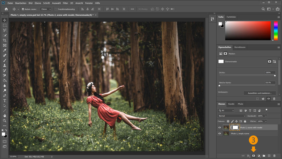 3. Wähle die Ebene „Foto 2, szene mit modell“ aus. Klicke unten im Bedienfeld Ebenen auf Vektormaske hinzufügen. Am Rahmen um die weiße Maskenminiatur kannst du erkennen, dass die Maske (und nicht das Bild) zur Bearbeitung ausgewählt ist.