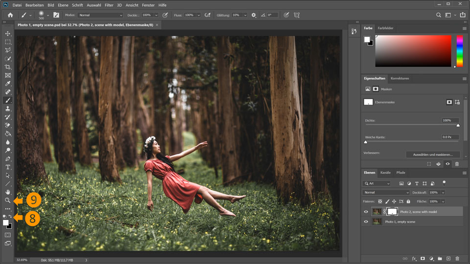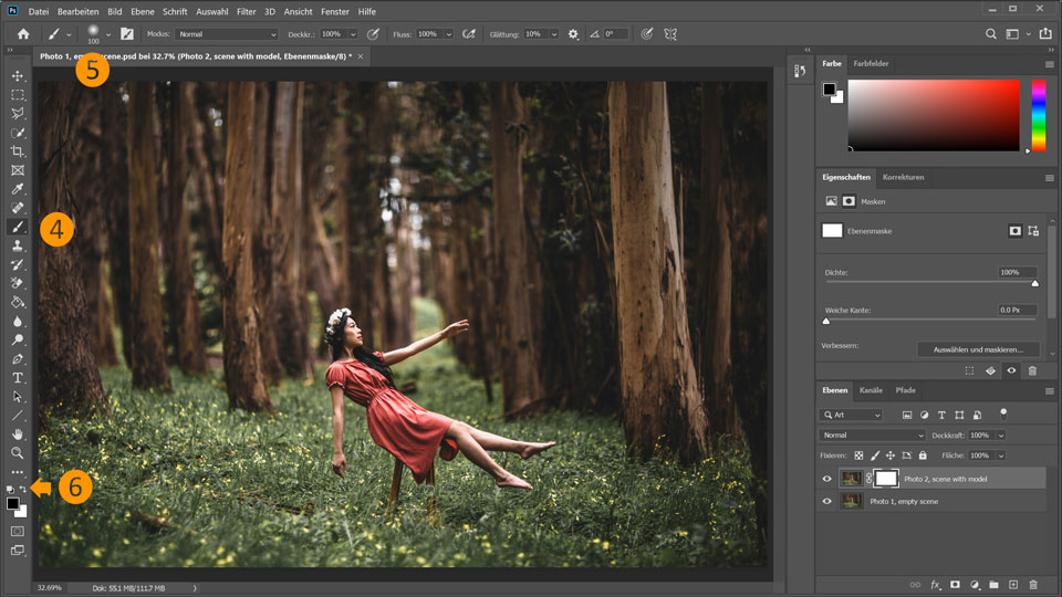 Tipp: Wenn du eine Ebenenmaske zur Bearbeitung auswählst, sind nur die Farben Schwarz und Weiß verfügbar. Mit der schwarzen Farbe „malst“ du Transparenz auf die ausgewählte Ebene, sodass die Ebene darunter sichtbar wird.