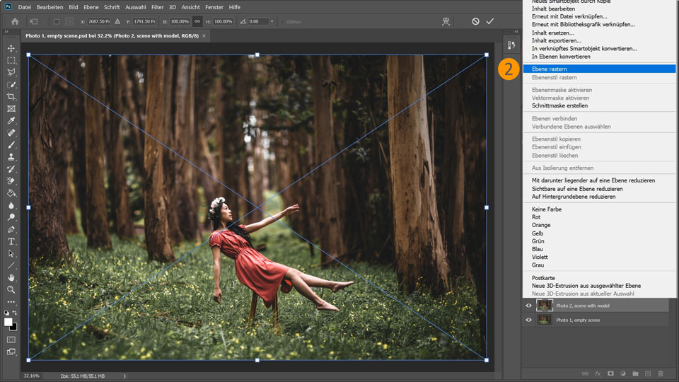2. Ziehe die zweite Beispieldatei („Photo 2, scene with model.jpg“) auf die Arbeitsfläche in Photoshop. Benenne die Ebene in „Foto 2, szene mit modell“ um. Klicke mit der rechten Maustaste bzw. bei gedrückter Ctrl-Taste auf die neue Ebene, und wähle Ebene rastern.