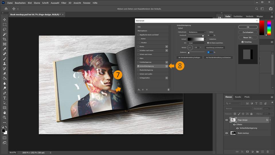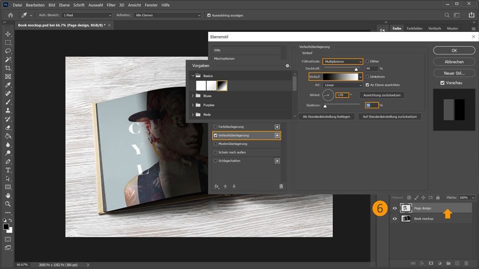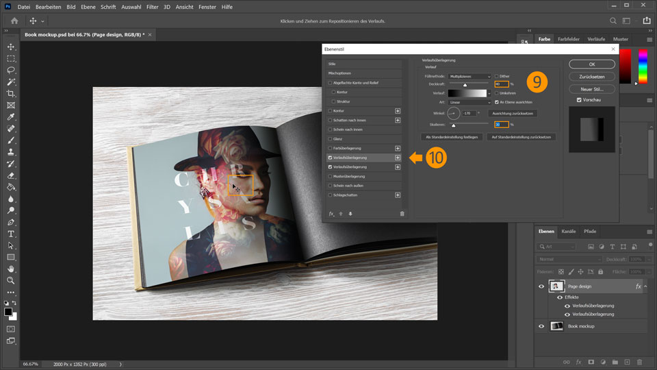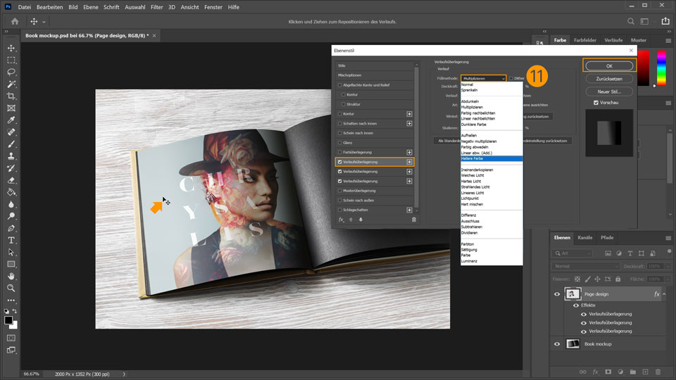 11. Wähle als Füllmethode „Negativ multiplizieren“. Ziehe den Verlauf auf die Grafik, sodass die linke Seite des Buchs stärker beleuchtet ist. Klicke zum Abschluss auf OK.