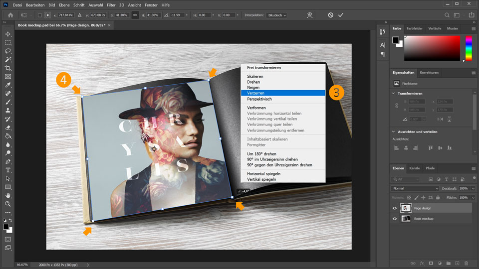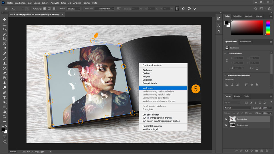Füge ein fertiges Design in das Bild eines aufgeschlagenen Buchs ein, und erzeuge mit den Transformierenwerkzeugen und Ebenenstilen eine realistische Anpassung an Form und Licht.