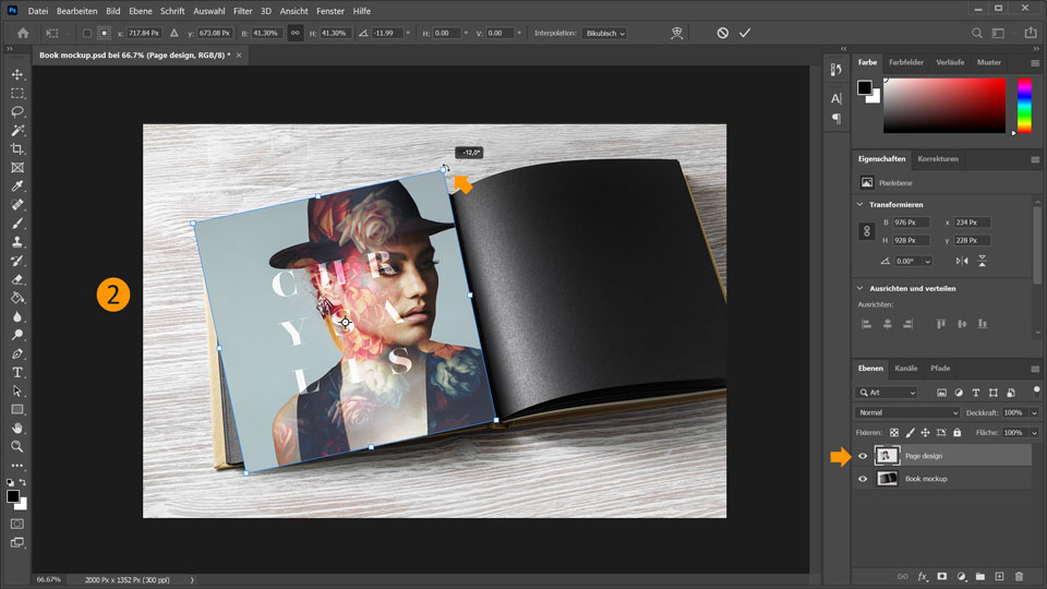 2. Wähle die Ebene „Page design“, und wechsle mit Strg+T (Windows) bzw. Befehl+T (macOS) zum Transformieren-Werkzeug. Ziehe das Design auf die linke Seite des aufgeschlagenen Buchs. Drehe das Design um etwa 12°, damit der Winkel zur Buchseite passt.