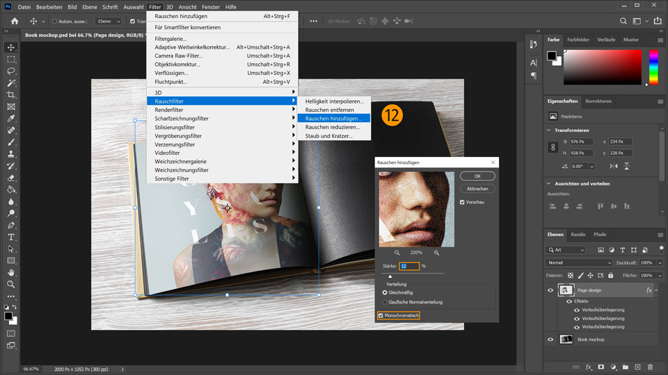 12. Zuletzt passt du das Design an die Körnung des Papiers an. Wähle dazu Filter > Rauschfilter > Rauschen hinzufügen. Ändere im Dialogfeld „Rauschen hinzufügen“ den Wert für die Stärke in 12 %, und aktiviere das Kontrollkästchen „Monochromatisch“.