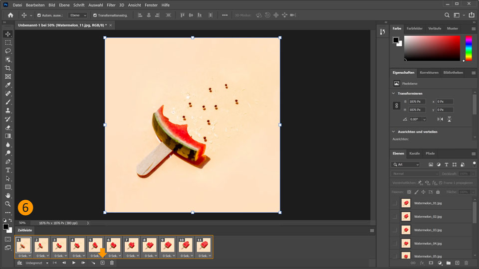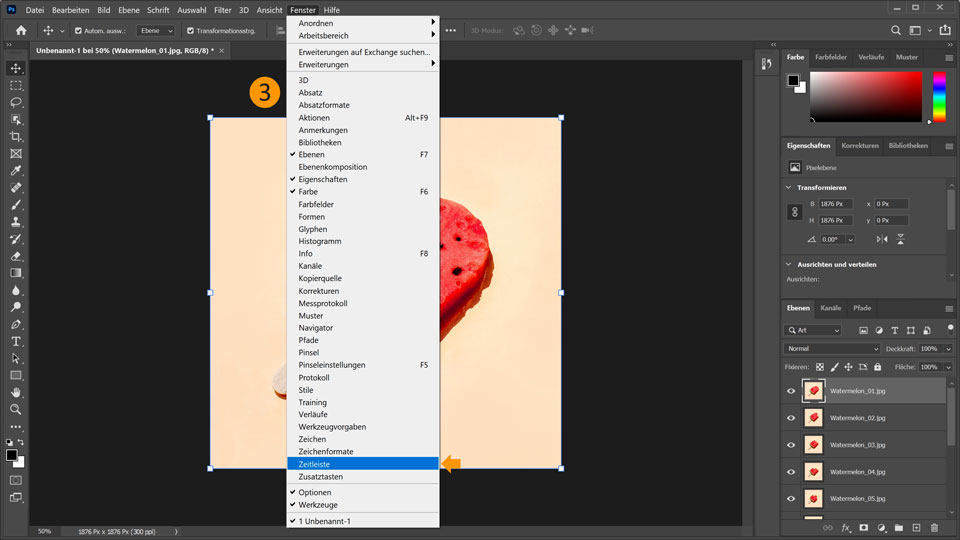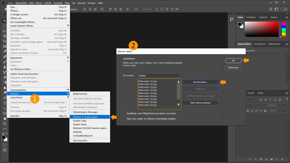 1.Übungsdateien herunterladen Wie du siehst, sind elf Dateien mit der Wassermelone vorhanden. Öffne diese nicht einzeln. Lade stattdessen alle Dateien als Ebenen in eine einzige Datei: Wähle in Photoshop den Befehl Datei > Skripten > Dateien in Stapel laden.